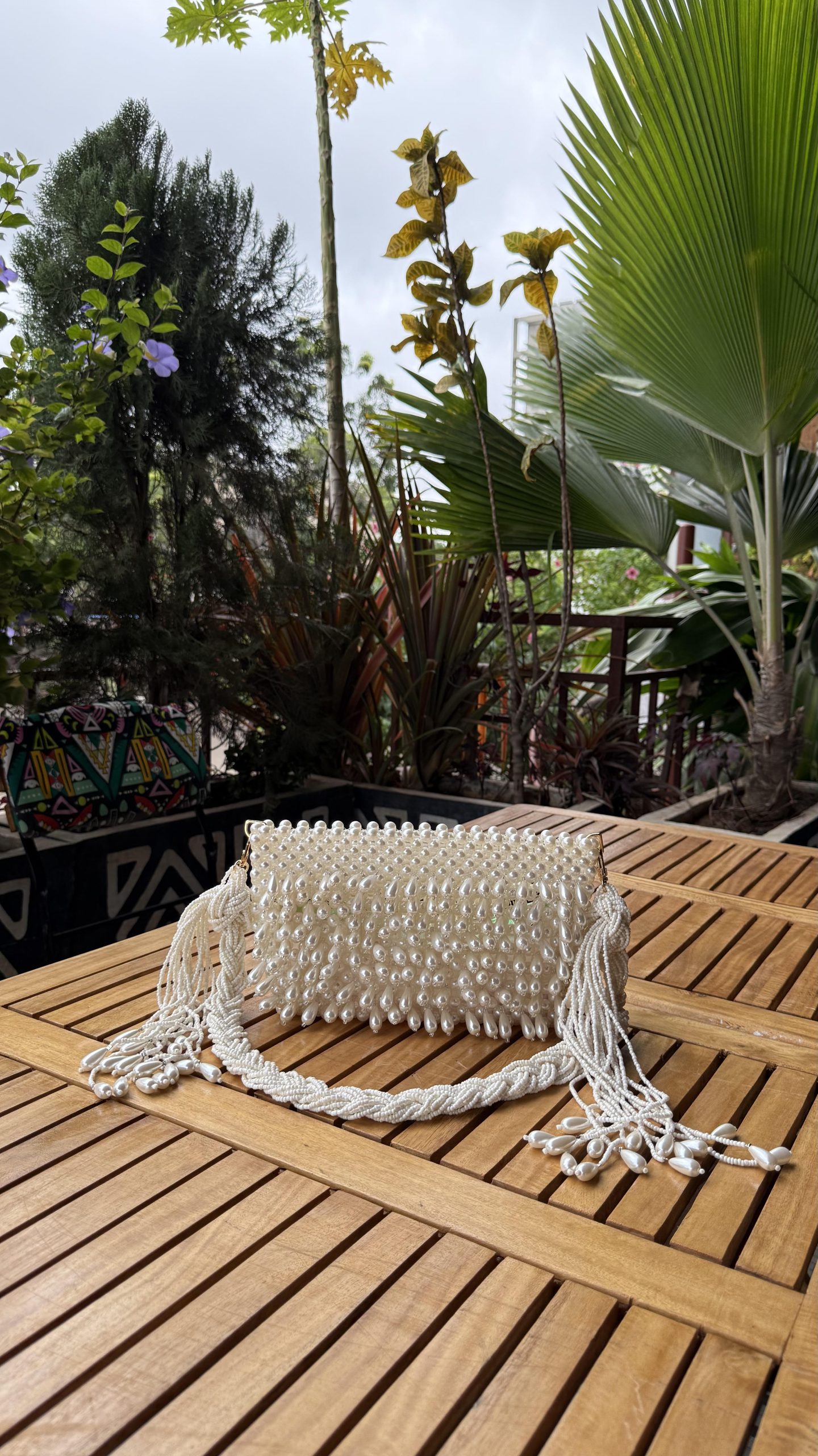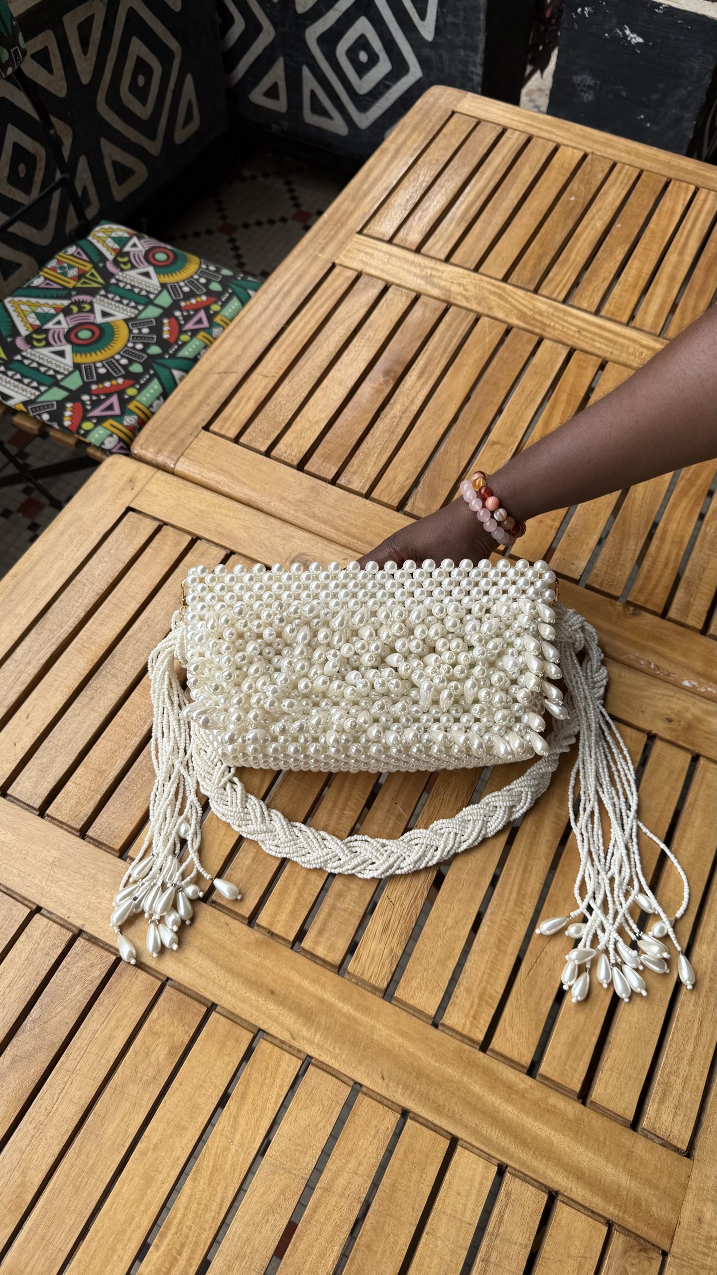 Candy bead bag made with marble coloured bead with Chain hardware handles . Comes with a jute pouch to keep your valuables